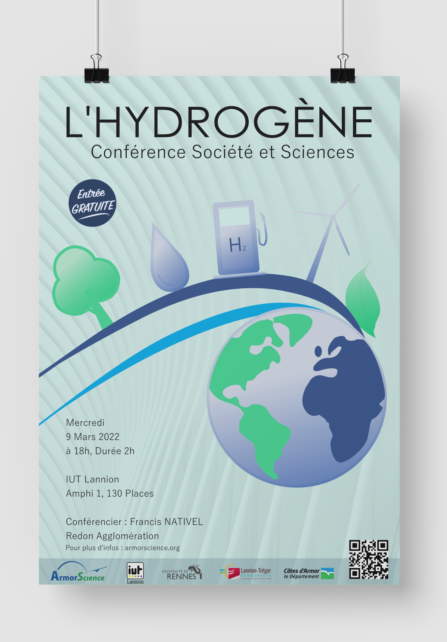 Dans le cadre d'une coopération entre les étudiants de MMI et l'association Armor Science, j'ai réalisé une affiche pour la prochaine conférence d'Armor Science portant sur l'hydrogène. Les informations au sujet de la conférence comme le titre et les logos nous étaient imposés mais nous étions libres pour le reste de la création. Je suis parti sur l'idée de la planète pour insister sur le côté écologique de l'hydrogène, en ajoutant des éléments liés à ce dernier tels que l'eau, la pompe à hydrogène...
